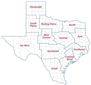 A map of the 12 Texas A&M AgriLife Extension districts.
