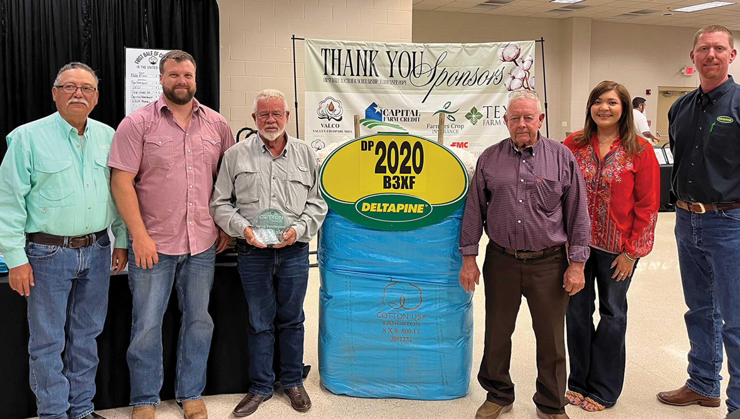 Verne Vanderpool of Alamo, Texas, harvested the bale on June 14 from a field planted to the variety DP 2020 B3XF and delivered it to Willacy Co-op Gin for processing. The Harlingen Cotton Committee gave Vanderpool Farms, LLC a $4,000 reward for delivering the first bale.