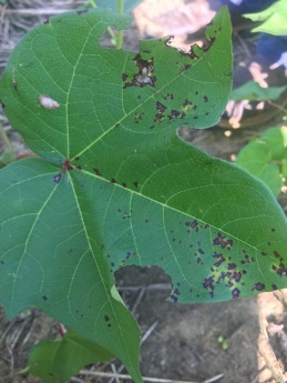 Bacterial blight lesions on leaves are angular and often run down the vein of a leaf. Impacted areas may initially appear water soaked, particularly if looking at the underside of the leaf, before turning necrotic. Lesions often appear in a shotgun pattern across the leaf (see above) and can move onto the boll.