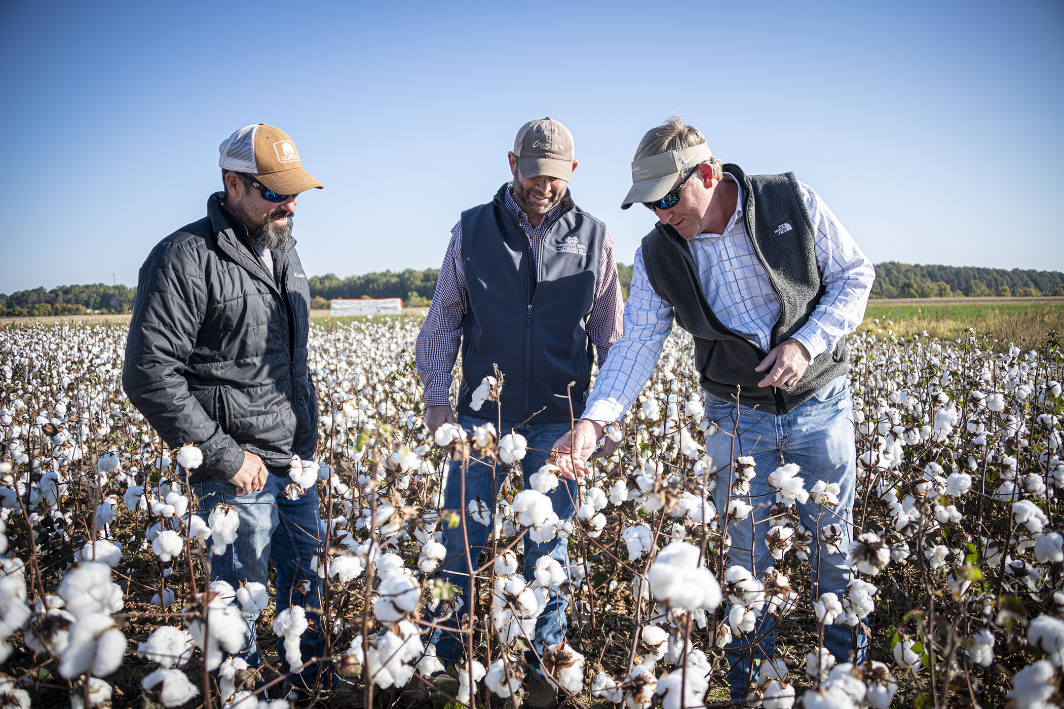 MSU faculty researchers, from left to right, Brian Pieralisi, Daniel Chesser and Wes Lowe analyze cotton in a field at the university’s MAFES R. R. Foil Plant Science Research Center. (Photo by David Ammon)