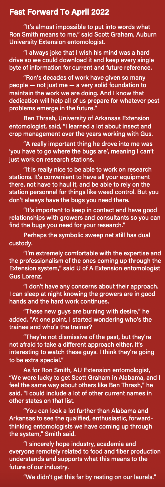 Circa mid 1990s — “I would say watching the transitions in products and the ability of an insect to adapt to whatever is thrown at it has been one of the most interesting and challenging aspects of my career. Don’t ever think you’ve won the battle. It’s just a matter of time.” — Gus Lorenz, PhD, Extension entomologist, University of Arkansas Division of Agriculture