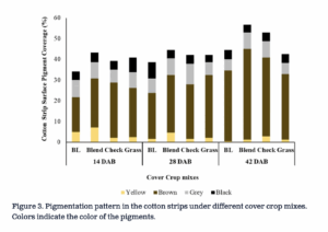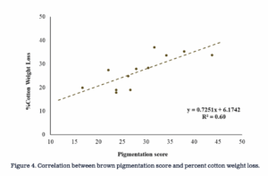 The pigments were mostly of four different colors: yellow, brown, grey and black, which indicated the pigments produced by the active and dominant microbes in the soil. We studied patterns and abundance of pigments on the cotton strips (Figure 2). Our preliminary results indicated that the blended 50-50 mix of grass and broad leaf cover crop species influenced the highest levels of microbial activity and composition as indicated by the highest recorded pigmented area on the cotton strips (Figure 3). We also found that the brown pigments produced by the microbes strongly correlate with the microbial activity as indicated by the loss of cotton strip weights (Figure 4). It is an ongoing research, and we are studying the pigmentation in further details. However, these results give us promise that this method can be performed rapidly and easily in farm fields and reading colors is simpler than any laboratory tests. We hope to come up with more standardized and calibrated criterias and more updated protocols in the near future.