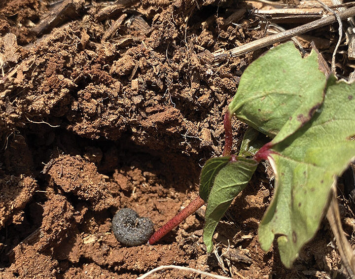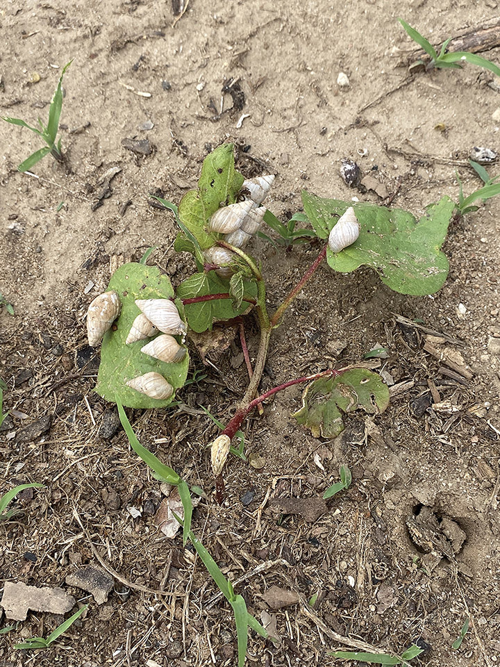 Snails are another mollusk pest that are becoming more of a threat to cotton stand establishment. Although a more consistent issue in in south Alabama, infestations have been observed in central and in northeast Alabama as well. The most common species of snails currently observed in Alabama cotton feeds on detritus and decaying organic matter, not cotton plants. Damage is caused from the sheer number of snails that climb on seedlings, with the resulting weight breaking the plants and causing stand loss.