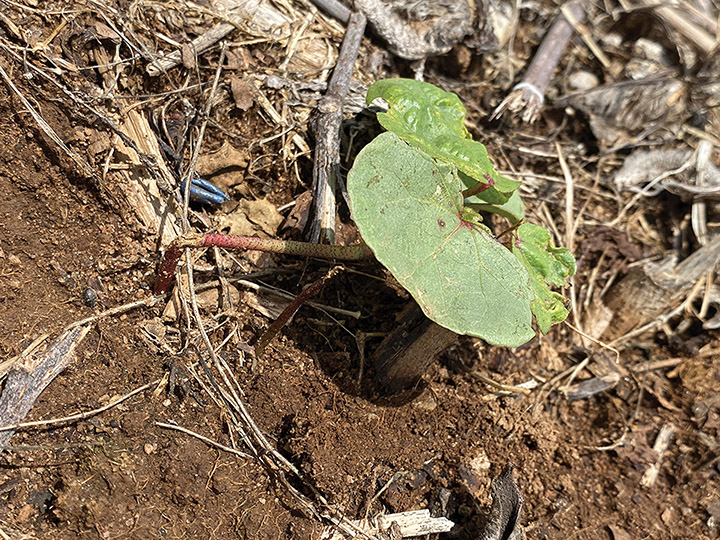 Three-cornered alfalfa hoppers (TCAH) are a sporadic pest of seedling cotton. Infestations tend to be worse on field borders and in dry springs when migrating adults move from weedy hosts to cotton fields. TCAH damage seedlings by feeding around the mainstem (girdling), resulting in a “knot” below the cotyledons that reduces the plant’s ability to move nutrients and photosynthate. Damaged plants will appear stunted, the leaf veins will turn dark red, and the leaves will turn a red-orange color. Typically, girdling is not a concern once plants reach the 6- or 7-node stage.