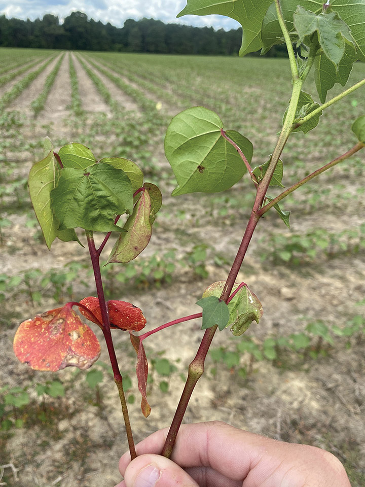 Determining when to treat for spider mites requires some professional judgement, as management decisions are not based on numbers of mites found. In addition to the number of plants showing symptoms, and the severity of symptoms, the immediate weather forecast should also be taken into consideration. If no significant rain chances are expected in the next few days, treatment may be warranted. Up-to-date thresholds and insecticide recommendations can be found in the Alabama Extension Cotton IPM Guide IPM-0415 (https://bit.ly/36CieUA).