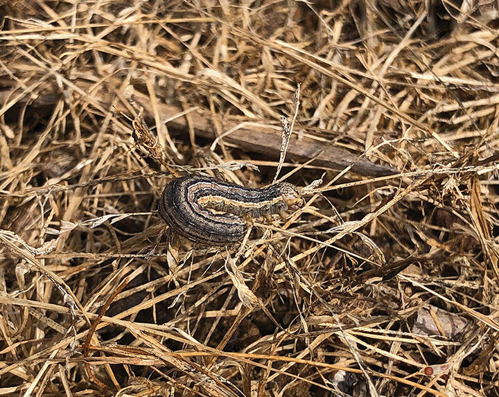 These caterpillars are commonly found on grasses in the spring and may require treatment in wheat. Thus, infestations may be more likely behind fields with grass cover crops, such as cereal rye. The caterpillars are a light brown or tannish color and have characteristic black bands around their legs. Like other spring pests, the threat of damage is from stand loss by caterpillars clipping seedling stems.
