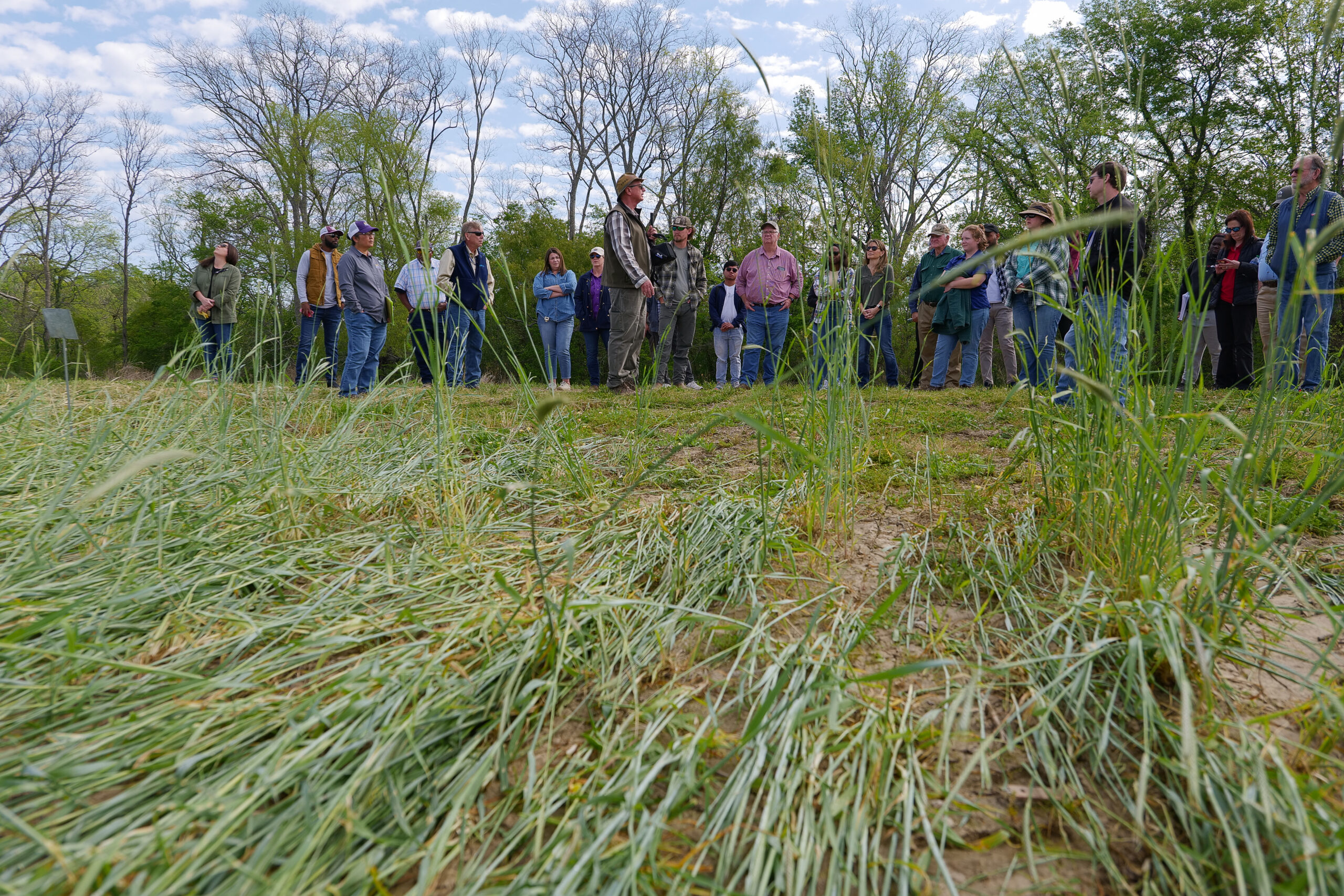LSU AgCenter Northeast Research Station coordinator Dennis Burns, center left holding microphone, talks to attendees of a March 30 field day about rolling and crimping cereal rye, causing it to lie flat as seen in foreground. Cereal rye is a common cover crop, and rolling and crimping it is a way of “terminating” it before planting cash crops while providing mulch to cover bare soil. Photo by Olivia McClure/LSU AgCenter