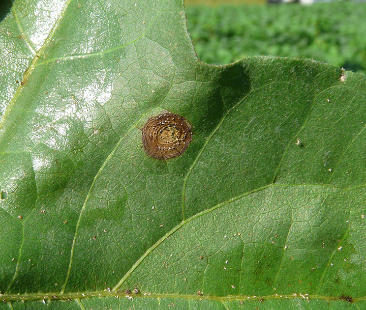 “Target spot disease, or corynespora, begins as a small spot and develops into white lesions with the characteristic, target-like concentric circles on them. At this state, the plants begin to defoliate rapidly.”