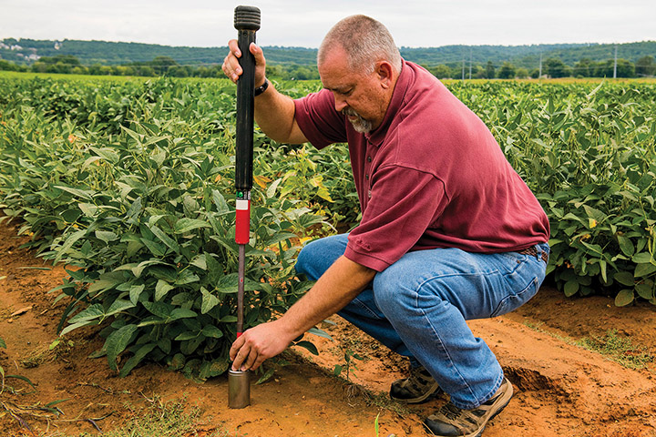 Kristofor Brye, university professor of applied soil physics and pedology, uses a slide hammer and core chamber to collect a soil sample in a soybean plot.