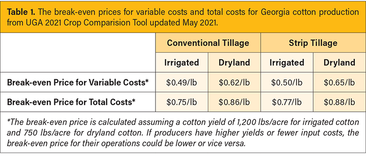 According to the University of Georgia 2021 Crop Comparison Tool updated in May 2021 (Table 1), the break-even cotton prices for total costs in Georgia, which cover variable and fixed costs, range from 75 to 88 cents per pound.