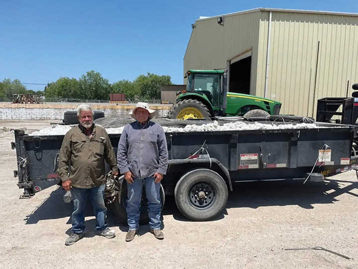 Wesley Vanderpool (right) harvested this year’s first bale of cotton — a Stoneville 4990B3XFvariety — near Alamo, Texas. Pictured alongside Wesley is his partner, Verne Vanderpool.