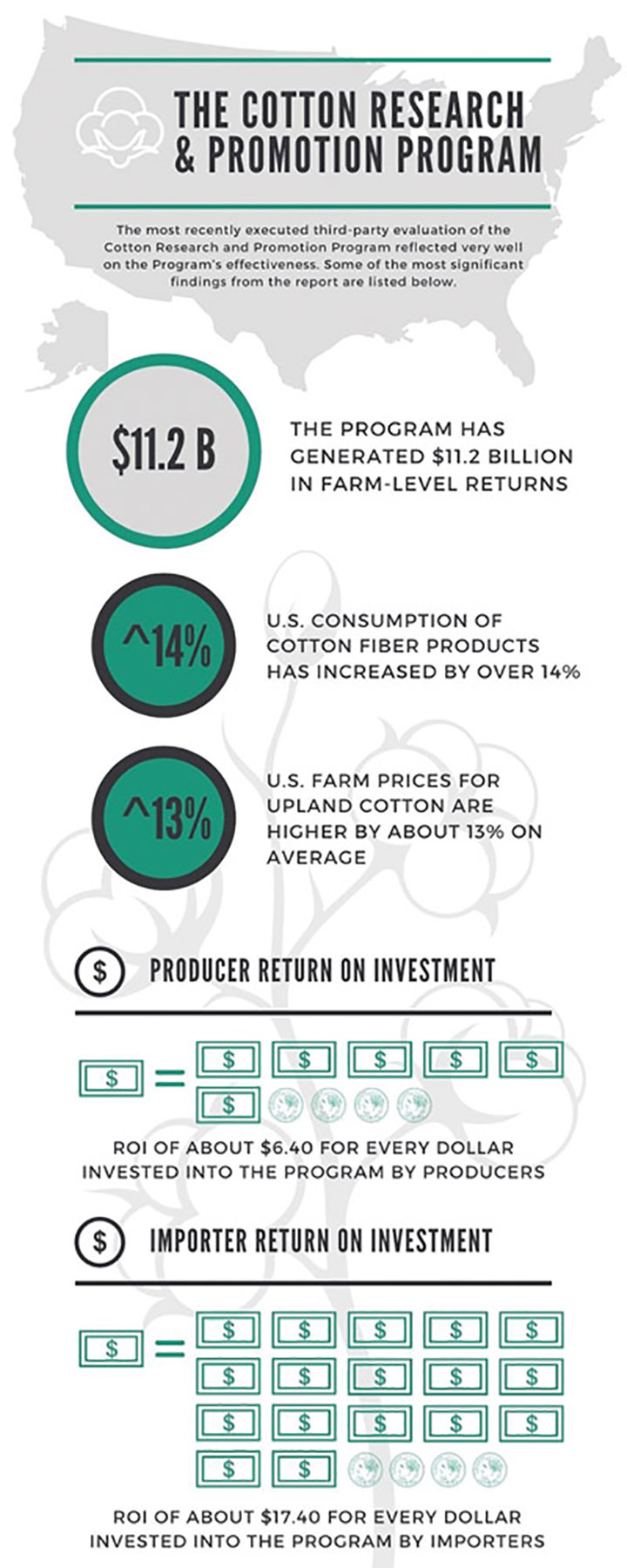 The most recent study was published earlier this year. It is detailed and explicit in its findings, saying, “The cotton checkoff program has enhanced cotton and cottonseed demand, augmented U.S. cotton yields and production as well as cottonseed prices, and generated a positive return to both cotton producers and importers.”