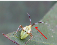 Nymphs are often greenish-yellow in color possessing red and white horizontally striped antennae. Larger nymphs can also be identified by a dark spot on the dorsal side of the abdomen.