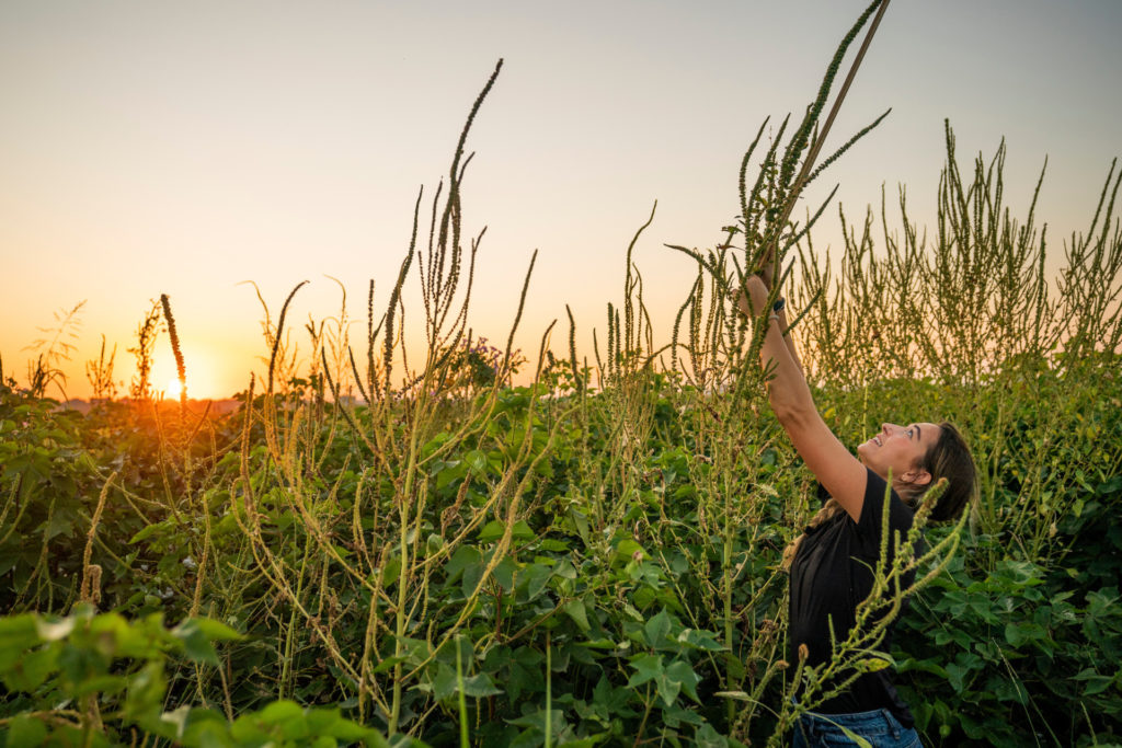 Sarah Kezar’s research in a cotton field is determining the importance of Palmer amaranth control in cotton late into the growing season — Texas A&M AgriLife photo by Sam Craft