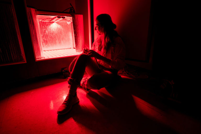 Sarah Kezar, a Texas A&M College of Agriculture and Life Sciences weed science doctoral candidate works with her light box that include red and far-red light bars, to see if they can affect Palmer amaranth seed germination — Texas A&M AgriLife photo by Sam Craft