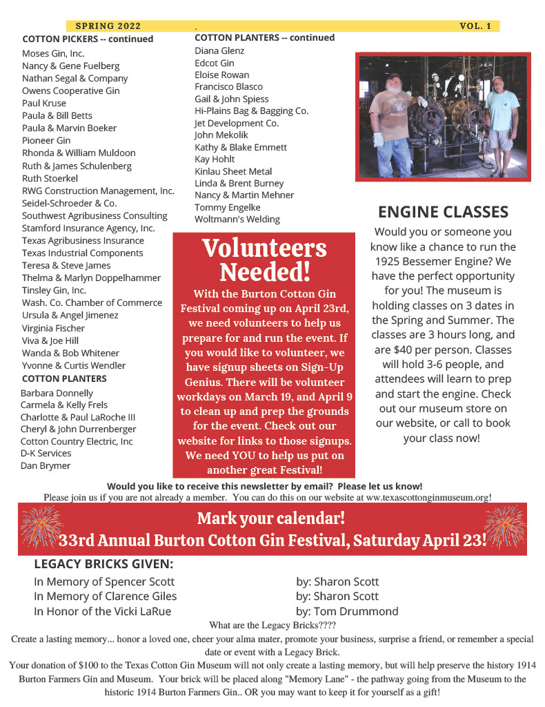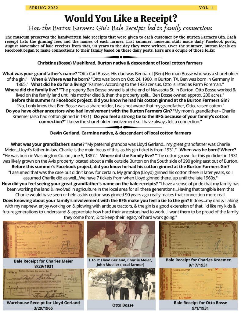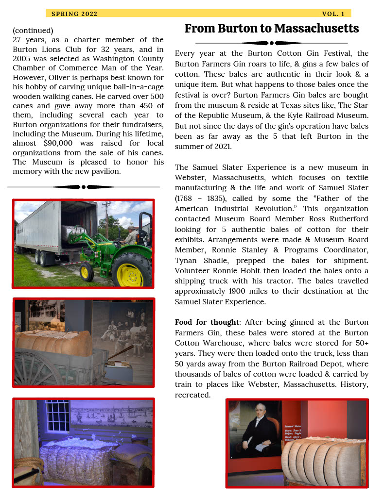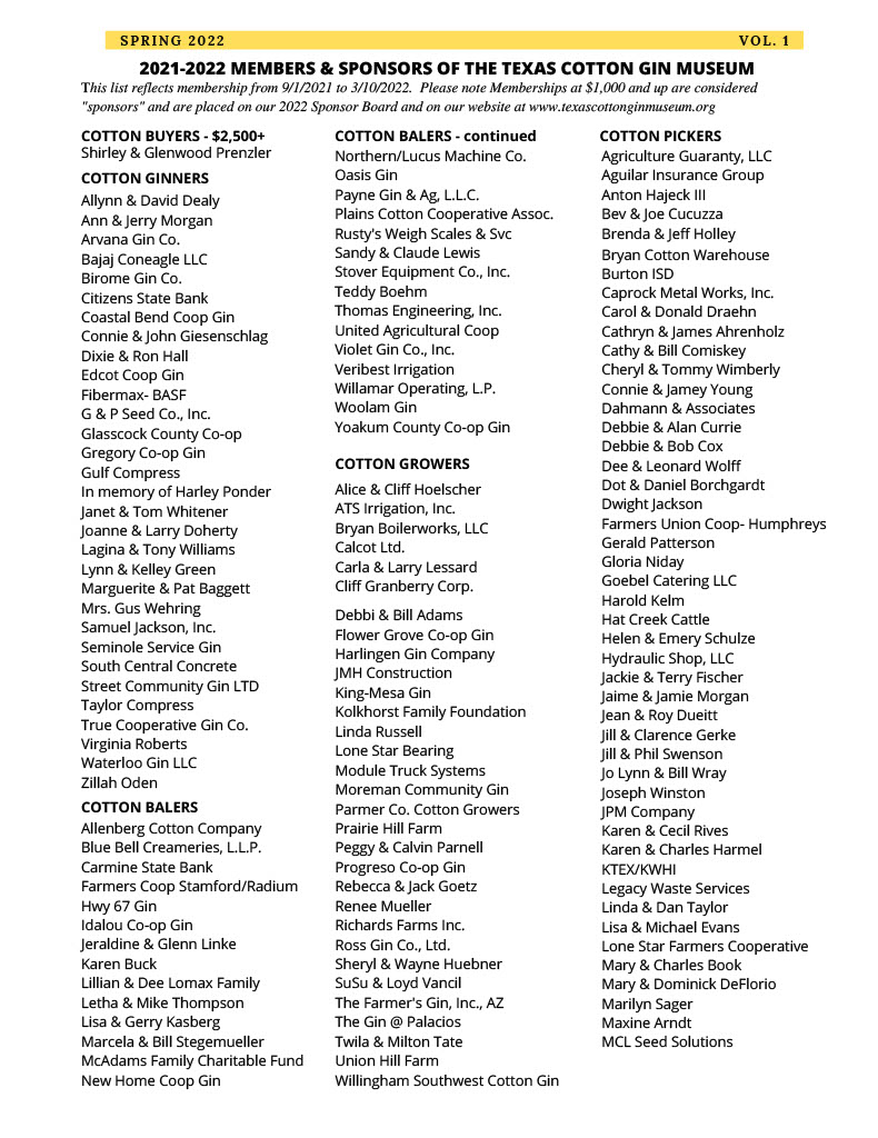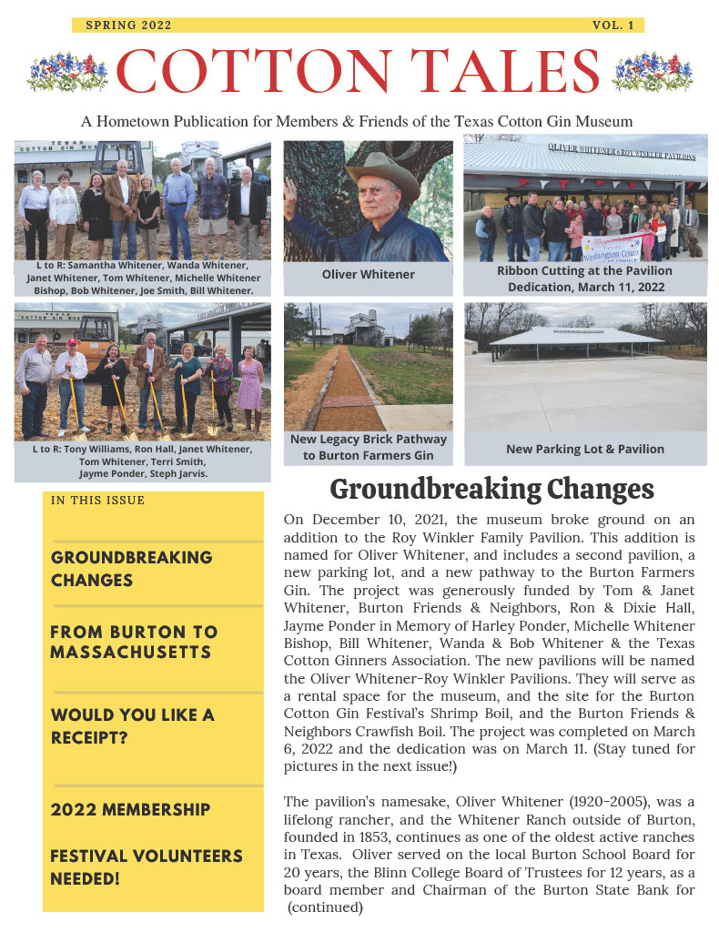 Enjoy the latest issue of Cotton Tales–The Hometown Publication for Members and Friends of the Texas Cotton Gin Museum. The historic landmark is in the heart of Burton, Texas, located on the same site where it was built more than 100 years ago halfway between Houston and Austin on Hwy 290. The museum is open for tours from 10 a.m.-4 p.m.